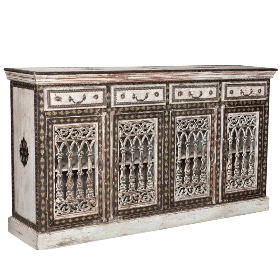 Роскошная тумба из тикового массива, укрепленная металлическими вставками. Благодаря своим размерам, данная модель может служить буфетом для посуды в столовой, или тумбой для хранения в гостиной. Своим шикарным внешним видом буфет обязан раритетным чугунным решеткам, украшающим стеклянные дверцы, и художественной латунной чеканке, обильно покрывающей переднюю часть мебели. Поверхность тумбы цвета слоновой кости состарена, местами из-под краски проглядывает дерево.