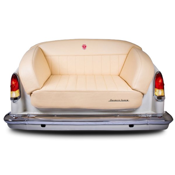 Диван, выполненный из задней части автомобиля ГАЗ-21 III Серии. Материал окраски - слоновая кость, материал дивана- экокожа.